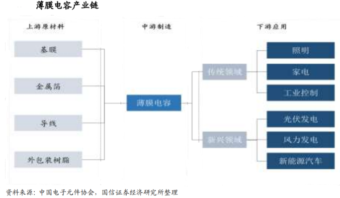 薄膜电容具有性能优、品种多、应用面广的特点,在传统领域与新兴领域都有应用。在传统领域中,其应用市场主要为家电和照明行业;在新兴领域中,薄膜电容器的应用市场主要是新能源汽车、光伏和风电行业。由于市场变化及技术的进步,照明领域对薄膜电容器的需求会放缓;而在未来,随着国家在智能电网建设、电气化铁路建设和新能源(光伏, 风能,汽车)等方面的加大投入,能突破常规,耐高温、耐高压、耐大电流的高端薄膜电容产品才能适应市场升级换代需要。
