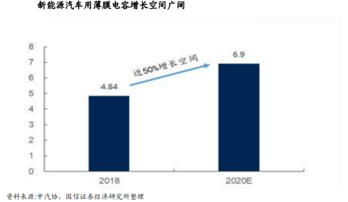 根据中国汽车工业协会公布的中国新能源乘用车和客车销售数据,2018 年我国新能源汽车在薄膜电容领域的市场规模约为 4.84 亿元,2020 年有望达到 6.9 亿元,国内市场未来两年存在近 50%的增长空间。