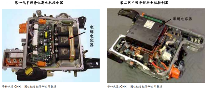 新能源汽车市场是薄膜电容优势正在显现的市场。新能源汽车中电气化的比率进一步提高,使用电驱动以后,输出功率越来越大,对应要求的输出电压就越来越高,对电容的耐压和耐冲击性的要求越来越高。而薄膜电容在过去多年的技术发展和其本身的特性正好满足了新能源汽车的使用要求,实现了对电解电容的替代。自丰田普锐斯第二代车型使用薄膜电容后,如今新能源汽车已经开始普遍使用薄膜电容。比亚迪的 F3DM 和 E6 都使用了薄膜电容。