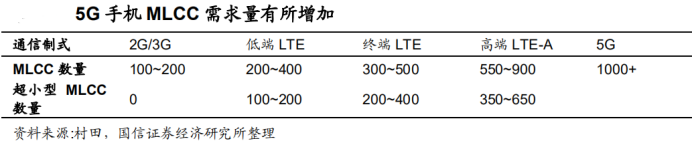 5G 手机 MLCC 需求有所增加。随着通信标准的不断升级,手机中 MLCC 的用量不断增加。据村田统计,手机的 MLCC 用量由 2G 时代的 200 个左右提升至 4G 时代的 700 个左右,预计 5G 手机 MLCC 用量将超过 1000 个,较 4G时代的增量为 300 颗。5G 手机功耗更大,电池容量更大,同时在设备轻薄化趋势下,更小尺寸、更大容量、更低功耗的高端 MLCC 产品才能满足需求。