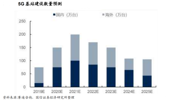 5G 基站 MLCC 用量较 4G 基站大幅提升。5G 因为高频、短波的特性,需要更密集的基站布置,基站建设数量为 4G 基站的 2 倍。据赛迪咨询预测,全球将迎来基站建设潮,2021 年将实现 200 万个 5G 基站建设;工信部数据表明,2019年中国已开通 12.6 万个 5G 基站,我国将 5G 基建纳入“新基建”之中,三大运营商有望进一步优化和扩大 5G 投资,5G 基站建设将在 2021 年达到峰值 100万个。