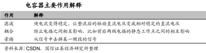 被动元件被称为电子工业的粮食。电容、电阻和电感作为三大被动电子元件,是电路中不可或缺的基础电子元件。电容通过静电的形式存储和释放电能,在两级导电物质间以介质隔离,并将电能存储其中,主要作用为电荷存储、滤波、旁路、耦合等。
