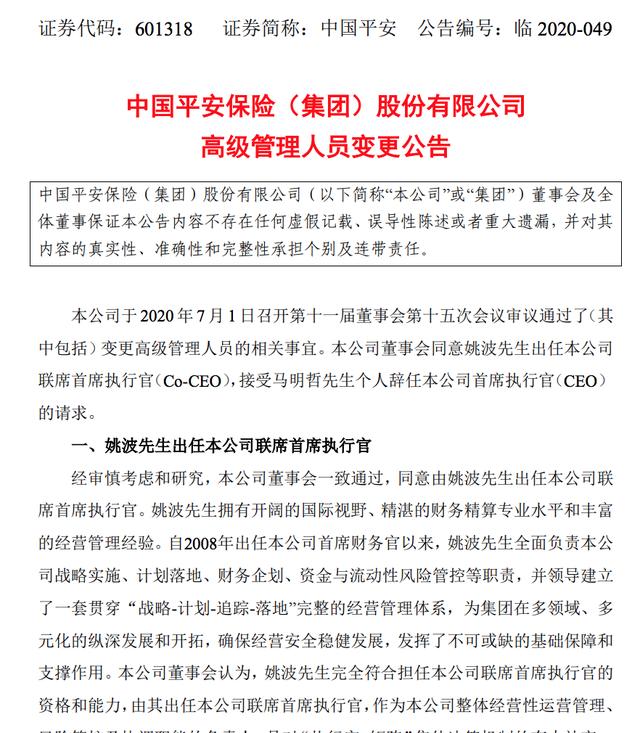 7月1日,中国平安(02318.HK,601318.SH)发布高级管理人员变更公告称,其第十一届董事会第十五次会议并决议,同意马明哲个人提出的辞去首席执行官职务的请求。辞任首席执行官后,马明哲继续担任董事长。