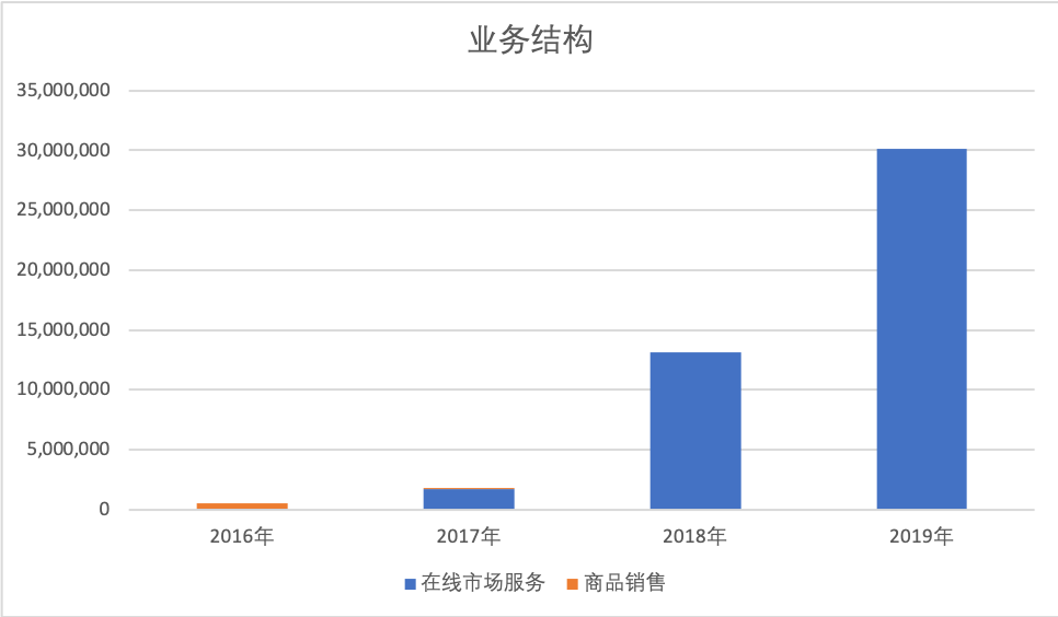 除了开支比较大,拼多多目前在营收模式上也仍然相对比较单一。2018年之后,拼多多的营收全部为针对商户的在线营销服务,即广告、交易服务等,并不包含其他平台收入的技术服务费或佣金,其中交易服务费是给到第三方支付的费用。