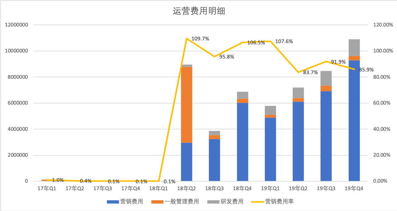 拼多多的运营费用一直高居不下。除了2018年第二季度的情况比较特殊,是由于员工人数和上市前后的股票薪酬费用增加,一般和管理费用暴增到人民币58.007亿元(8.766亿美元),较2017年同期的600万元大幅增加。