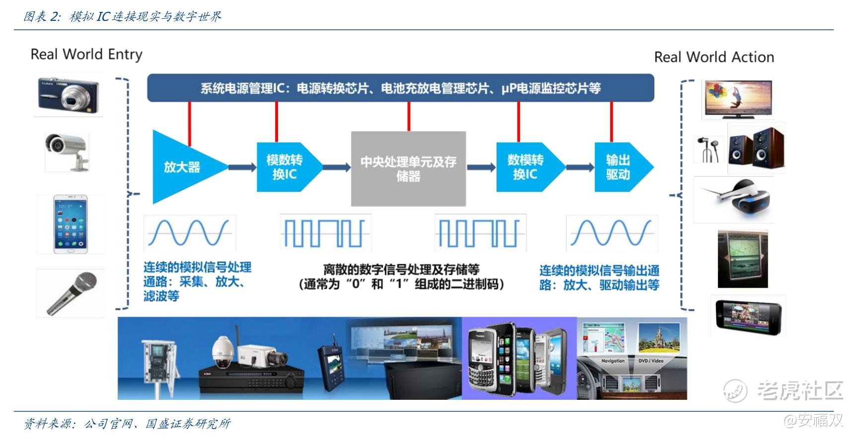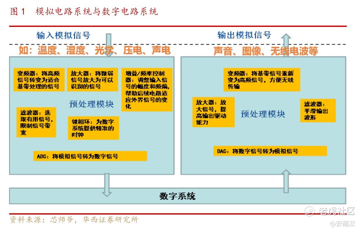 模拟信号在经过采集、滤波、放大,再经过一个 AD 转换器变成“0”和“1”数字信号,进行处理、存储等,经过数字系统处理后的信号再通过模拟电路进行后处理,转换为声音、图像、无线电波等模拟信号进行输出,模拟芯片作为虚拟与现实之间的桥梁,其重要性不可替代。