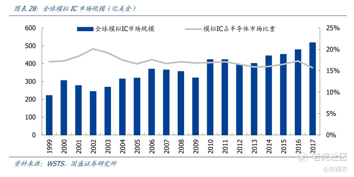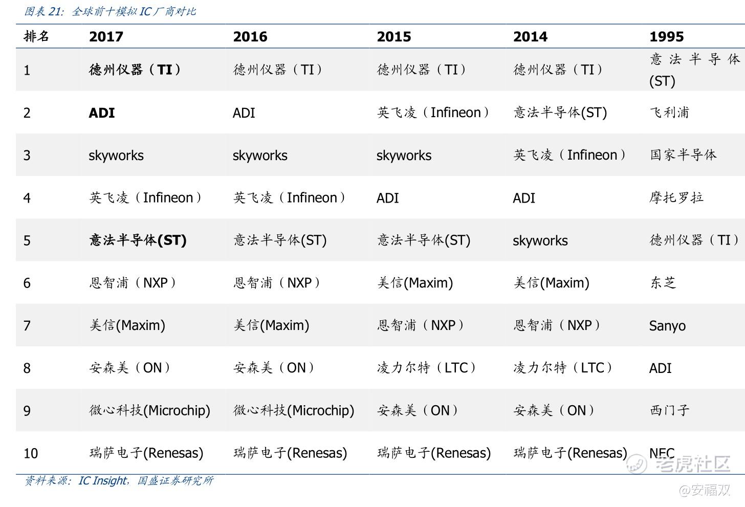 和晶圆制作工艺与流程,同时还要对大部分元件的电特性和物理特性了如指掌,这都需要时间与经验的积累。优秀的模拟 IC 企业经过长时间的研制和量产,可以将设计和制造中的各种问题积累起来,形成独一无二的技术壁垒。对比 1995 年和 2017 年模拟 IC 全球前十的厂商可以发现,如今前十的厂商中,仅有 Skyworks、美信(Maxim)与 1995 年前十的厂商关系不大,同时也只有东芝和 Sany 掉出如今的前十,而德州仪器、ADI、意法半导体等公司经过 22 年仍然是行业标杆。