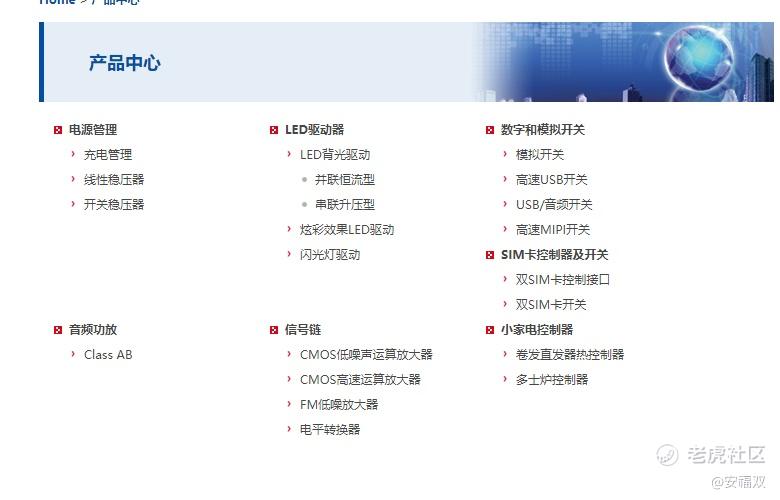 圣邦股份:有 16 大类 1000 余款产品,涵盖信号链和电源管理两大领域,包括运算放大器、比较器、音/视频放大器、模拟开关、电平转换及接口电路、小逻辑芯片、AFE、LDO、DC/DC 转换器、OVP、负载开关、LED 驱动器、微处理器电源监控电路、马达驱动、MOSFET 驱动及电池管理芯片等。