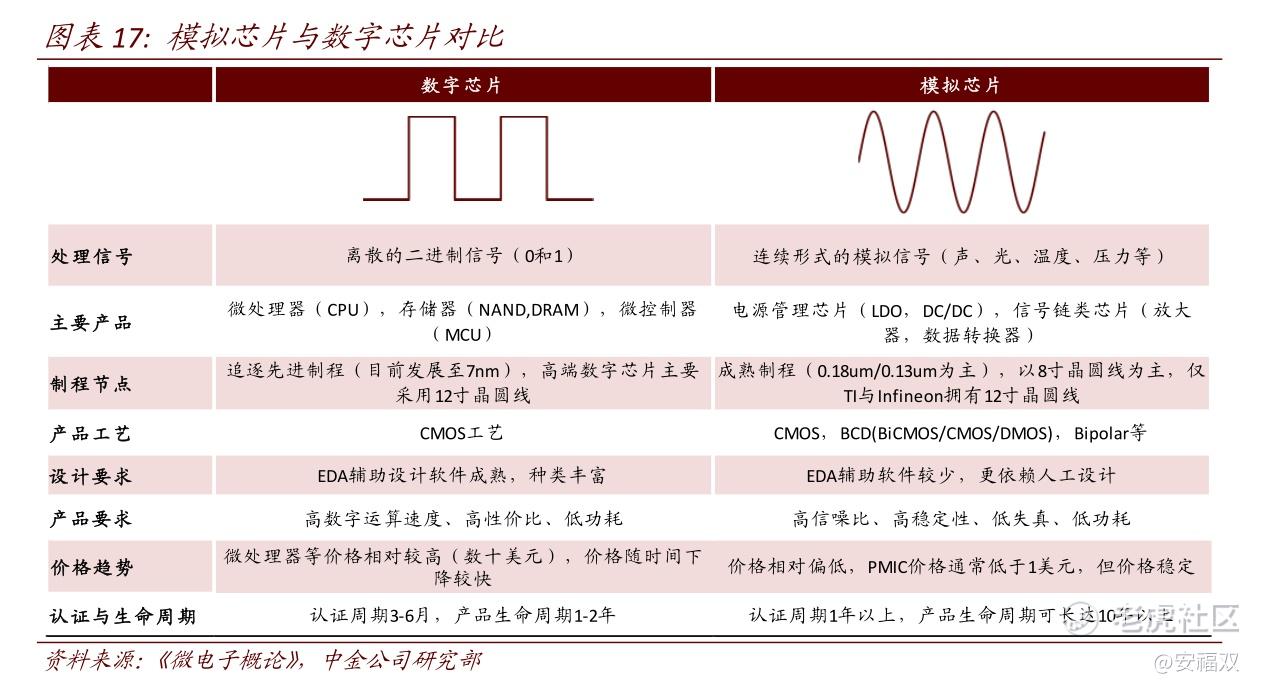 模拟芯片与数字芯片在制造工艺、性能要求、设计难度、产品特点等方面均有较大差别。