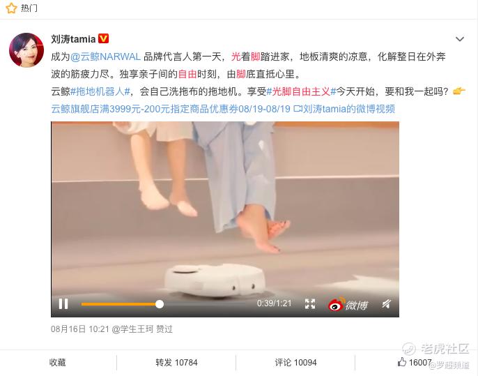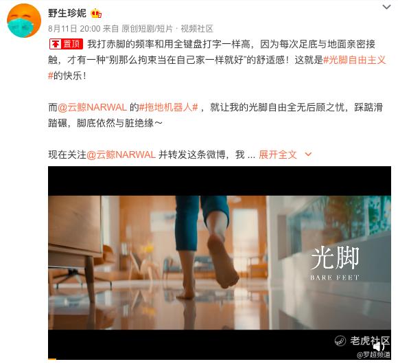 理念很好,关键看如何传播,发布这一品牌理念后,云鲸与微博达人@野生珍妮和@除了我都是猪(张可)联合制作发布了名为《光脚自 由主义》的短片,对“光脚自由主义”进行视频化的阐述。