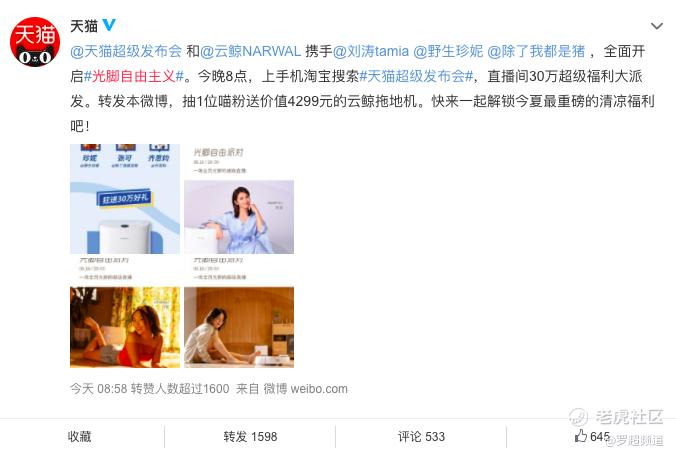 同时,云鲸利用微博、抖音、小红书的社会化传播能力进行话题预热,一共有200+达人参与,“光脚自由主义”话题全网互动量破亿,为后期的超级品牌日积蓄能量。