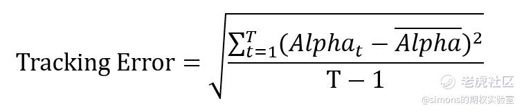 跟踪误差的公式看上去像在算标准差。是的,没错,其计算的就是alpha的标准差。还记得alpha的概念?alpha指的是你的年化收益率减去spy的收益率。用alpha代替收益率可以考量某基金经理跑赢大盘的能力。毕竟如果大盘一年涨15%,基金也涨15%(alpha=0),那这基金也没啥稀奇。