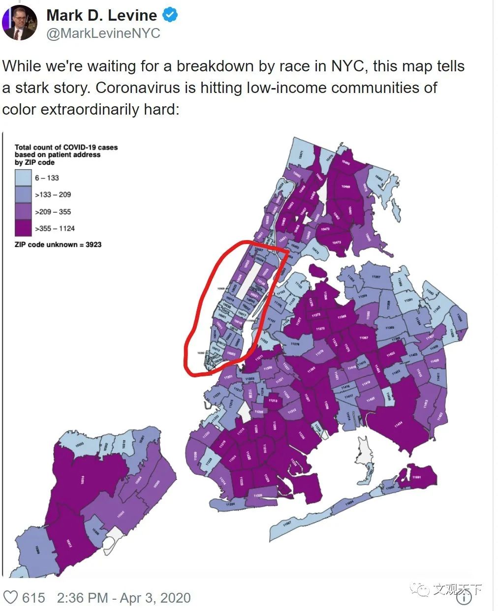 下图的红圈处是曼哈顿主要区域,可以看到按照确诊人数颜**分的深色块少于皇后区和布鲁克林区。