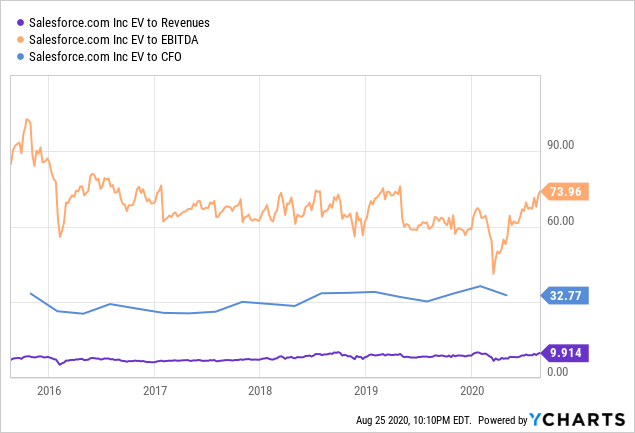 但对于Salesforce来说,情况并非如此。基于营收、EBITDA和营运现金流的估值倍数来看,Salesforce的股价与公司过去5年的平均估值水平一致。