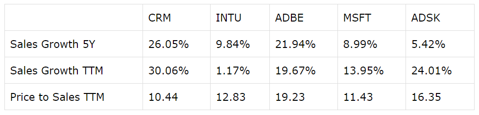 比较Salesforce与$财捷(INTU)$ 、$Adobe(ADBE)$ 、$微软(MSFT)$ 和$欧特克(ADSK)$ 的一些基本数据,Salesforce的价格看起来也相当合理。尽管这份比较并非具有完备可比性,因为四家公司在不同的领域运作,且有各自独特强弱点。然而足以了解一下Salesforce的估值大致情况。