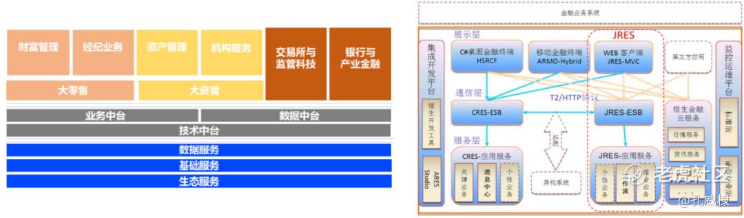 近年来蚂蚁集团和阿里系始终不遗余力地倡导“大中台”战略和“微服务”架构,认为其在产品开发、内部运维方面带来了极大的效率提升。而恒生电子的 6 纵 6横新架构也重点提及了三大战略,正是在一定程度上受到蚂蚁集团即阿里系的引导。