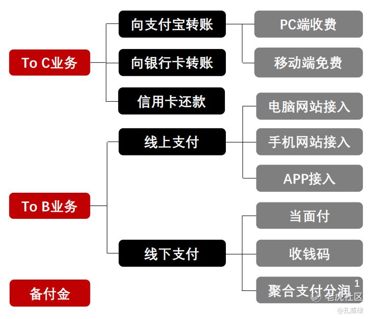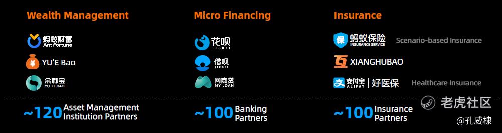 财富管理业务:借助蚂蚁财富(面向 C 端客户)、余利宝(面向 B 端客户)的平台,为资产管理机构引流,代销公募基金、理财型保险、信托产品、贵金属等全品类资管产品。目前,蚂蚁金服合作的外部资产管理机构数量超过 120 家。
