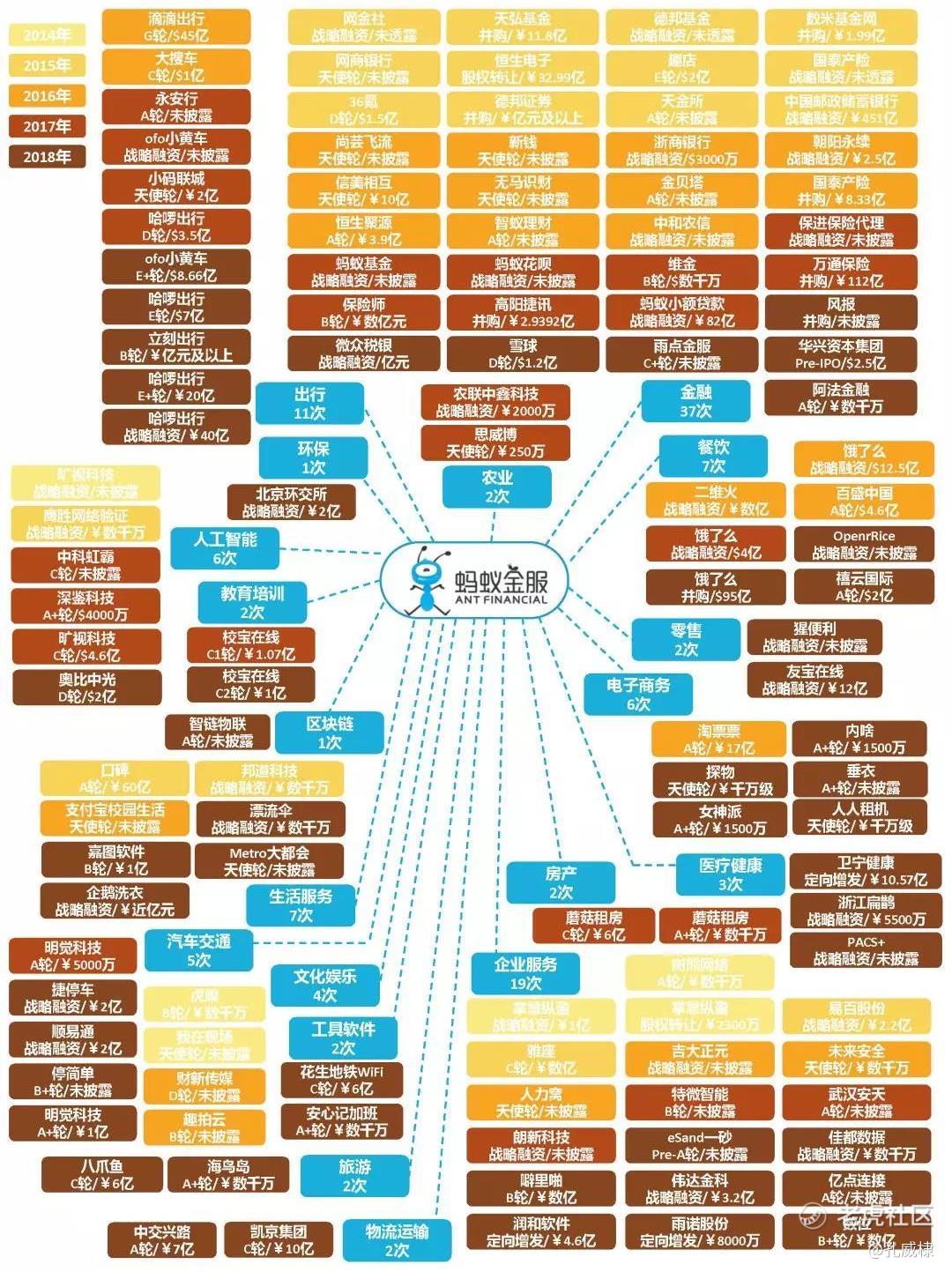 自支付宝独立以来,蚂蚁集团持续进行生态投资布局。截至 2018 年末公司对外投资超过 120 次,布局范围从单纯的金融科技上下游,逐步扩展至零售、医疗健康、旅游、物流运输、工具软件、区块链和环保领域。