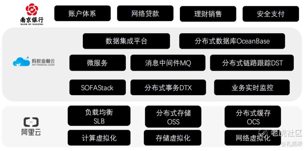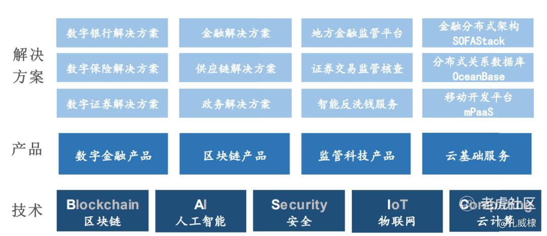 跨技术:定位解决方案,讲求多技术融合。丰富的底层技术和基础产品,为蚂蚁金服定制化的解决方案提供了充足的弹药。以蚂蚁金服、阿里云与南京银行共同合作的鑫云+互联网金融平台为例,其整合了 SOFA 中间件、OceanBase 数据库、大数据平台、移动互联网平台等多项技术,最终形成分布式的金融解决方案。