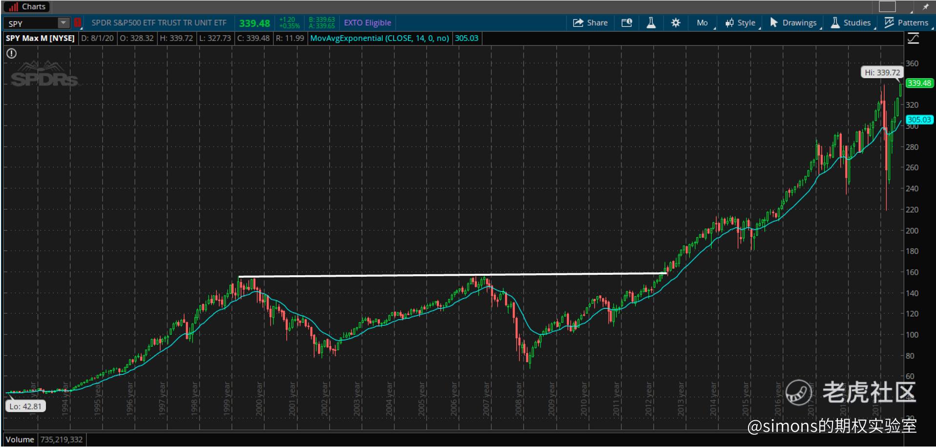 我们在来看SPY,我们处在美股10多年的牛市中,美联储印发了无数的货币推升了股票的价格。SPY10年内的最大回撤发生在了今年疫情的熔断期间,回撤在20%以内,4个月后SPY完全地涨了回来.长期持有SPY看上去似乎是不错的标的。那我们把时间拉长,看一下SPY的几十年的表现: