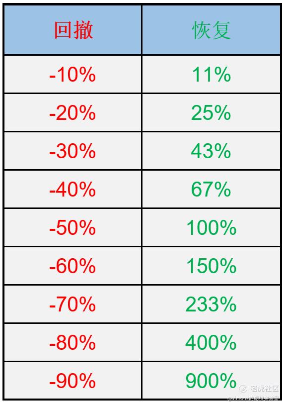 我们再来看一张表,这张表及其重要,希望初学的交易者都应该知道,表上的情况反映着一个令人沮丧的事实:资产的10%回撤需要上涨11%来恢复,回撤30%需要上涨43%来恢复,回撤50%后需要翻倍来恢复,越往后数字越惊人。基本上回撤50%以上,通过我们之前学习的标准差和概率分布可以知道,回本的概率变得微乎其微。想要回本的最后会演变成赌徒,但是概率不站在他这边。