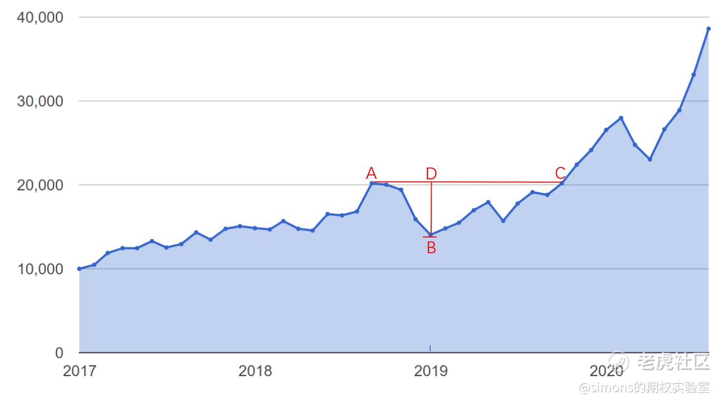 我们拿出在读懂你的收益率曲线(一)做出的资金曲线图,这是一个从17年1月1日买入100股aapl至2020年7月31日的资金曲线,我们在图上取A、B、C、D4点,如图: