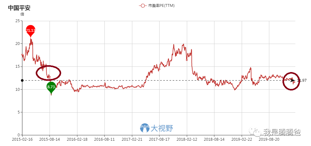 看上图,左圈处是我15年股灾期间首次买入平安时的市盈率估值,右圈处是当前平安的市盈率估值。