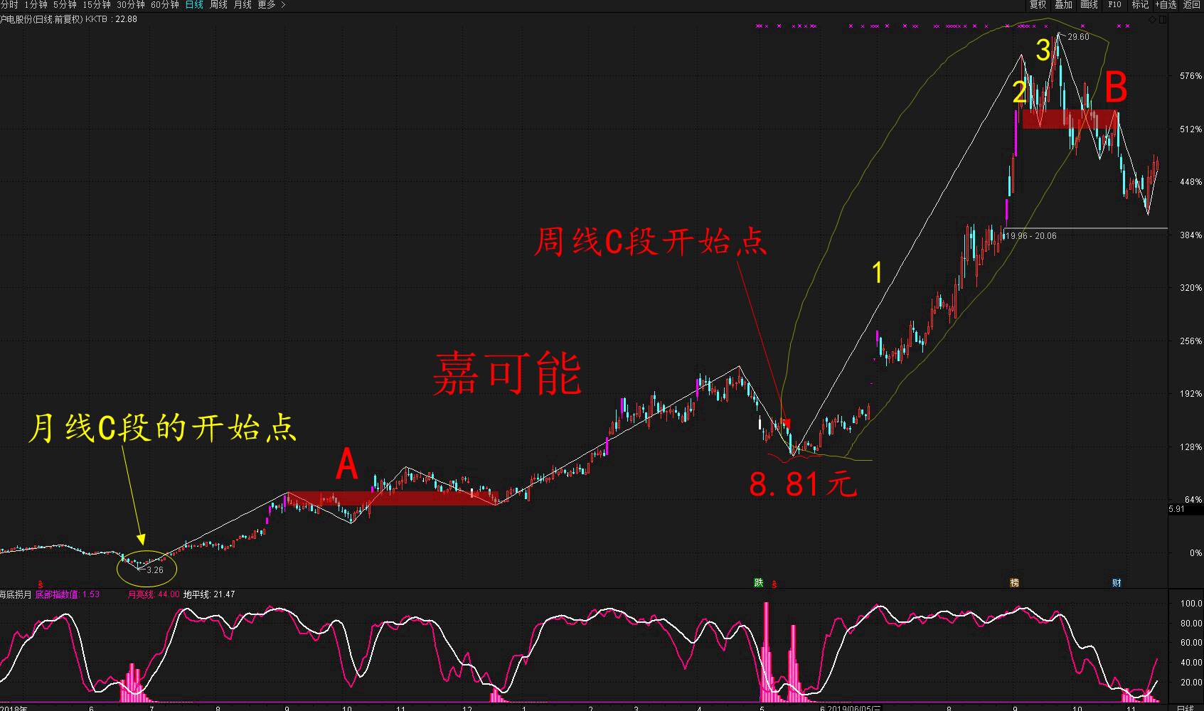 如上图所示,月线C段开始点,周线C段开始点,我们都可以找到并且标记出来。在日线走势图上,目前的沪电股份002463很有意思,如果我们的区间套是按照:(月线-周线-日线)三个级别逐级搜索,那么此刻,我们就可以马上分析了。