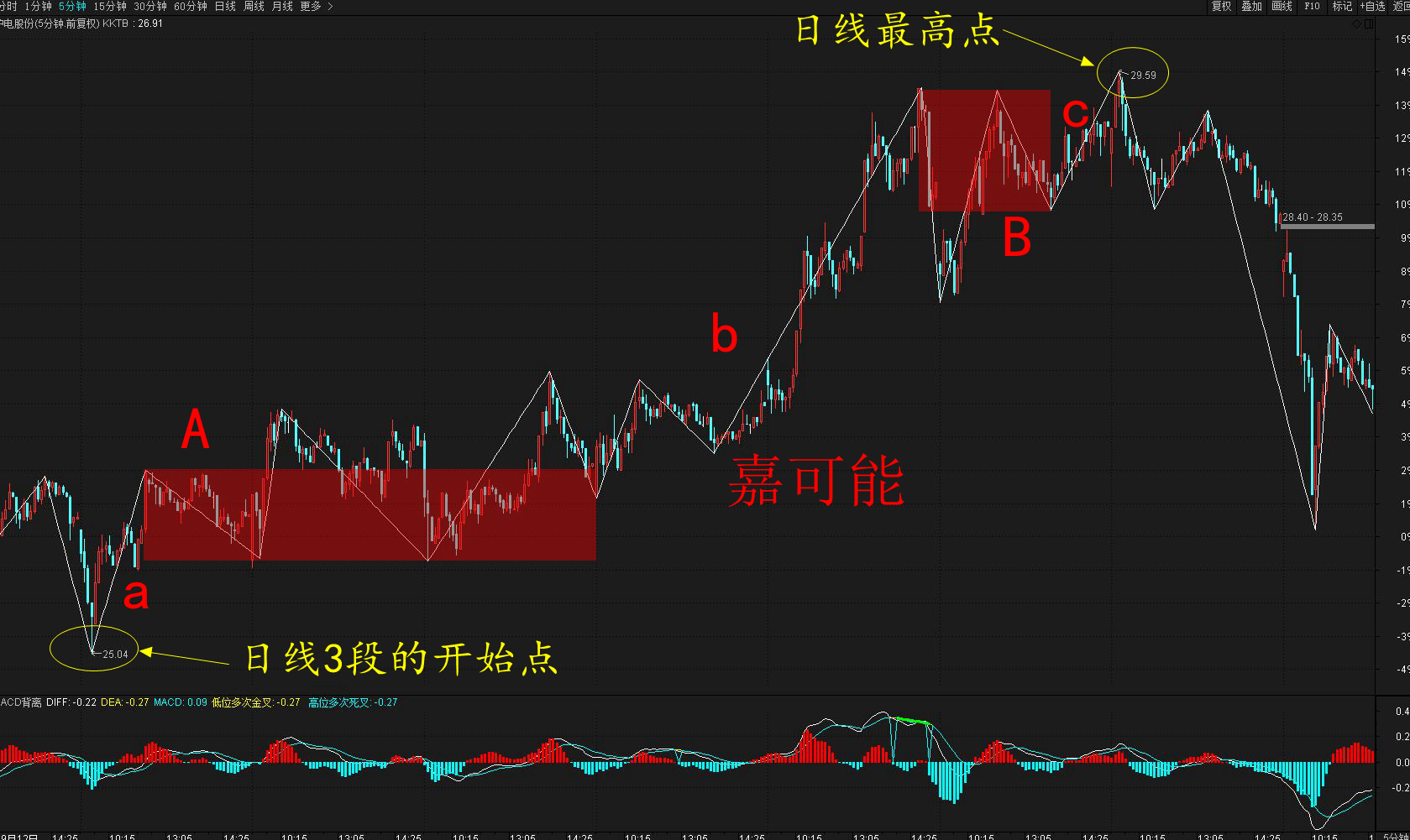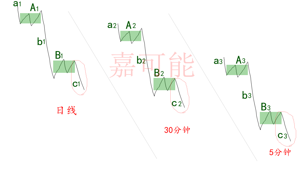 同时需要指出的是,任何股票走势不可能原原本本按照缠论标准化公式:( a+A+b+B+c )走出来的,否则就是太简单了。因此对于缠论区间套咱们不能生搬硬套。咱们需要学习的是它的搜索思想。一种递减搜索逻辑。它给我们的是对未来股价的一种方向判断,而不是精确到绝对的低点与高点。特别是实践过程中,很多时候我们不可能把握住小级别的精确点(比如1分钟),大多时候5F已经满足了大多数童鞋了。如果是大资金的30分钟都已经满足了。
