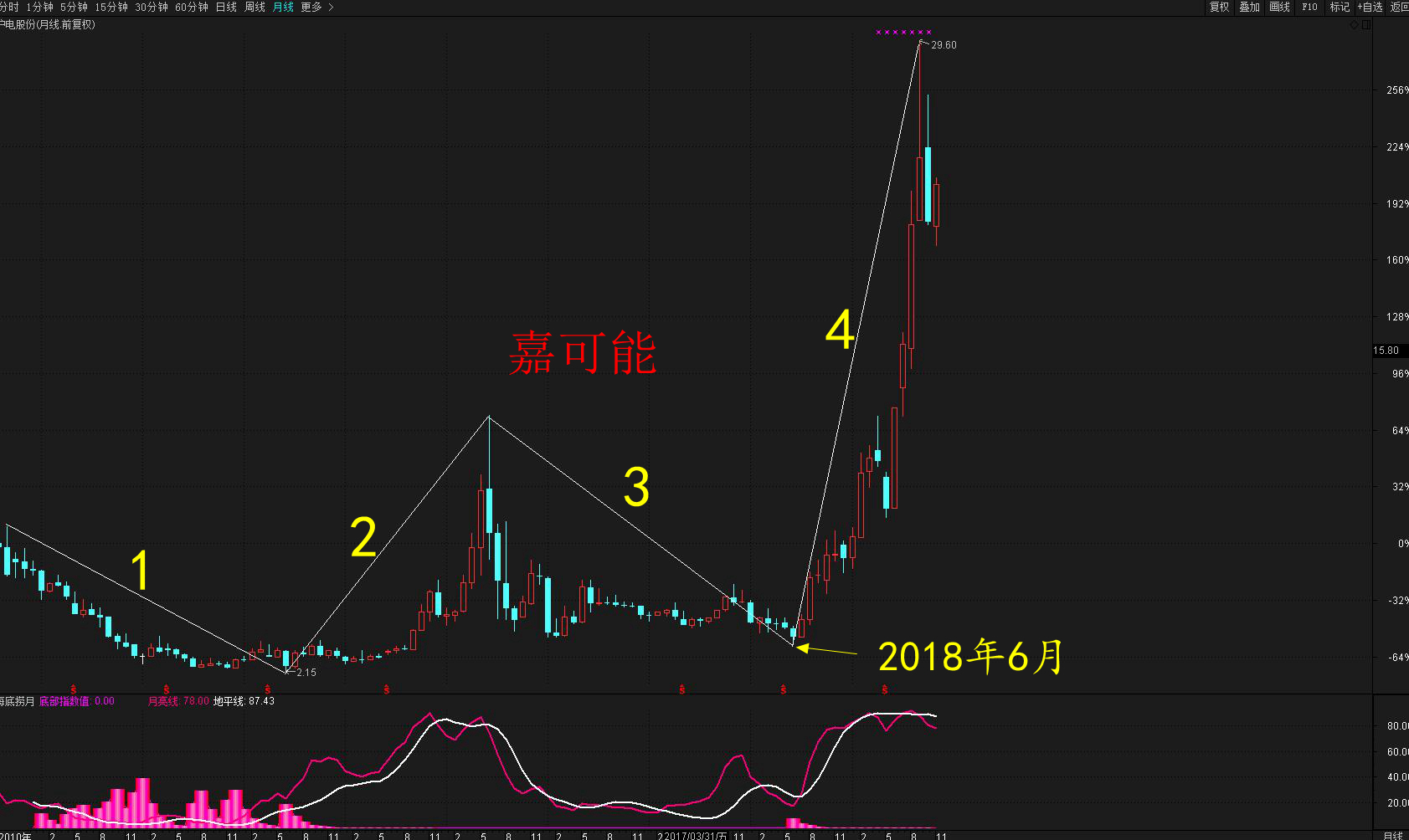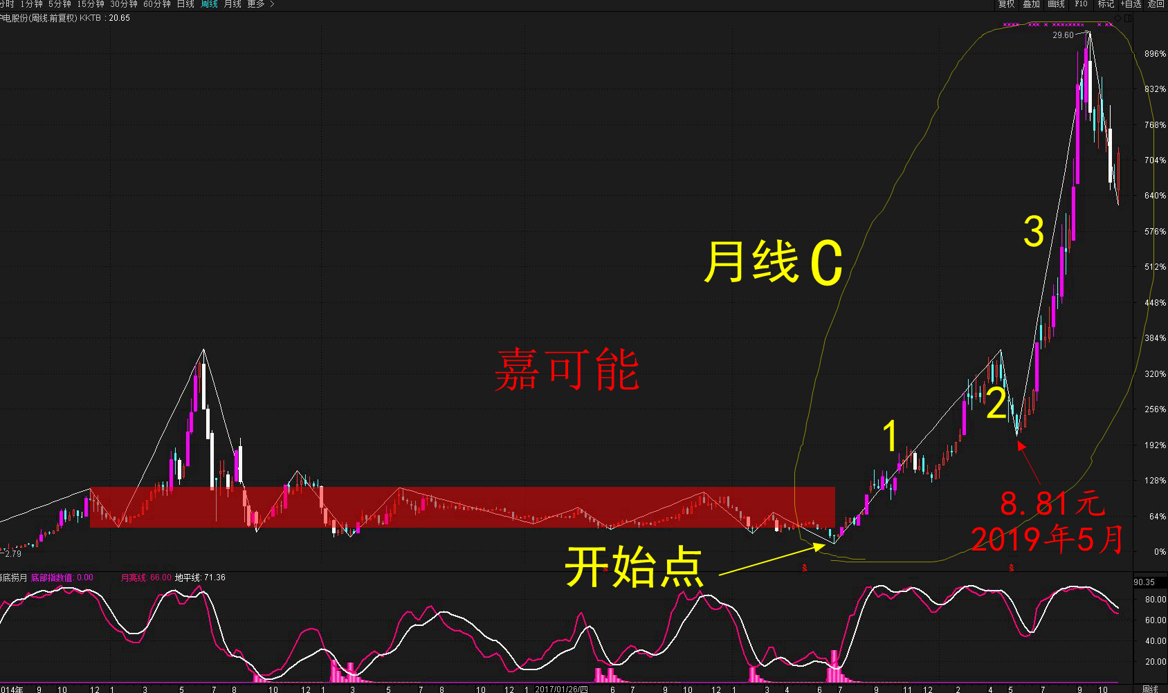 我们直接以股票沪电股份002463最近的高点为例,进行区间套实例分解。首先,我们从最大级别开始,即月线(因为季线还没走出来)如下图所示: