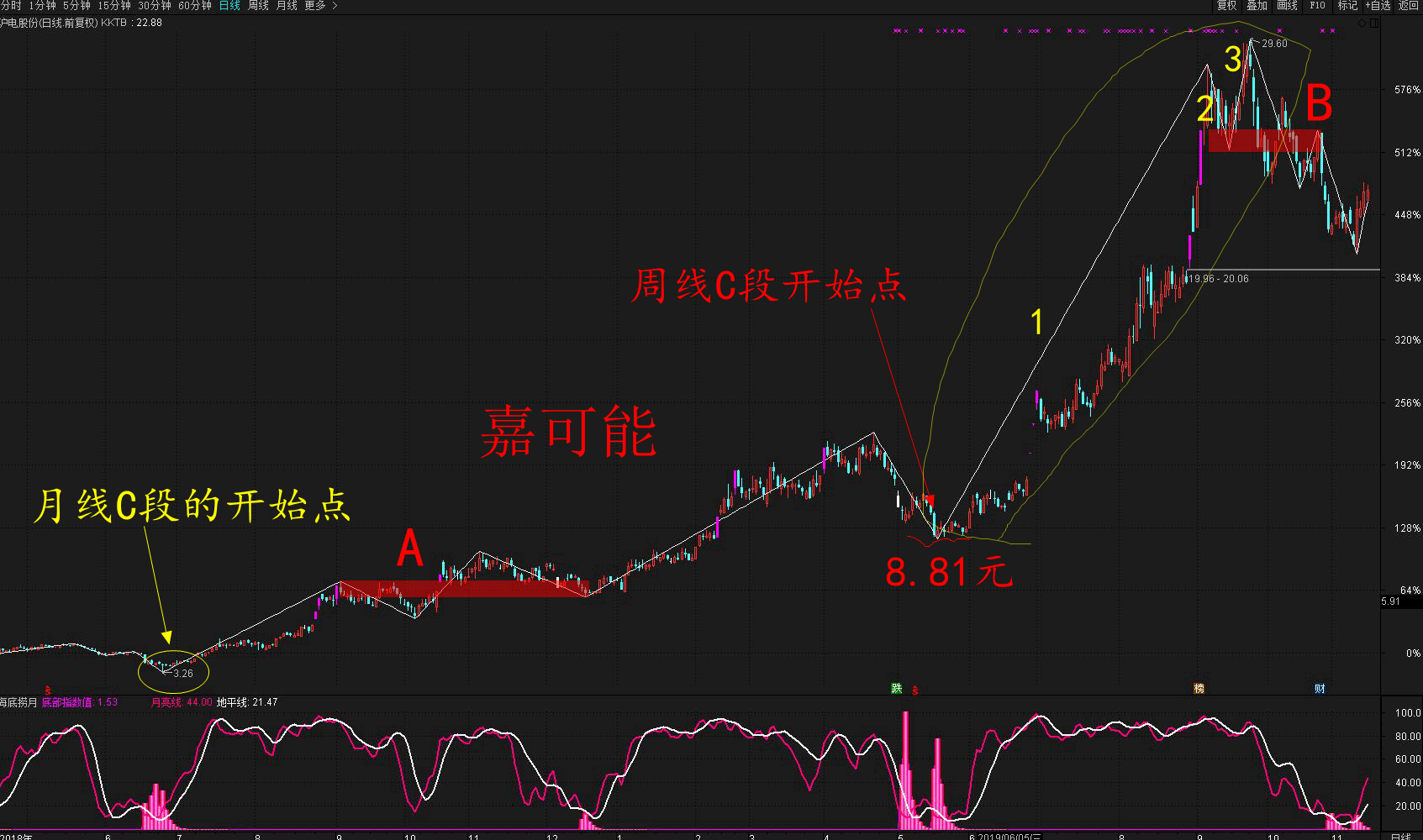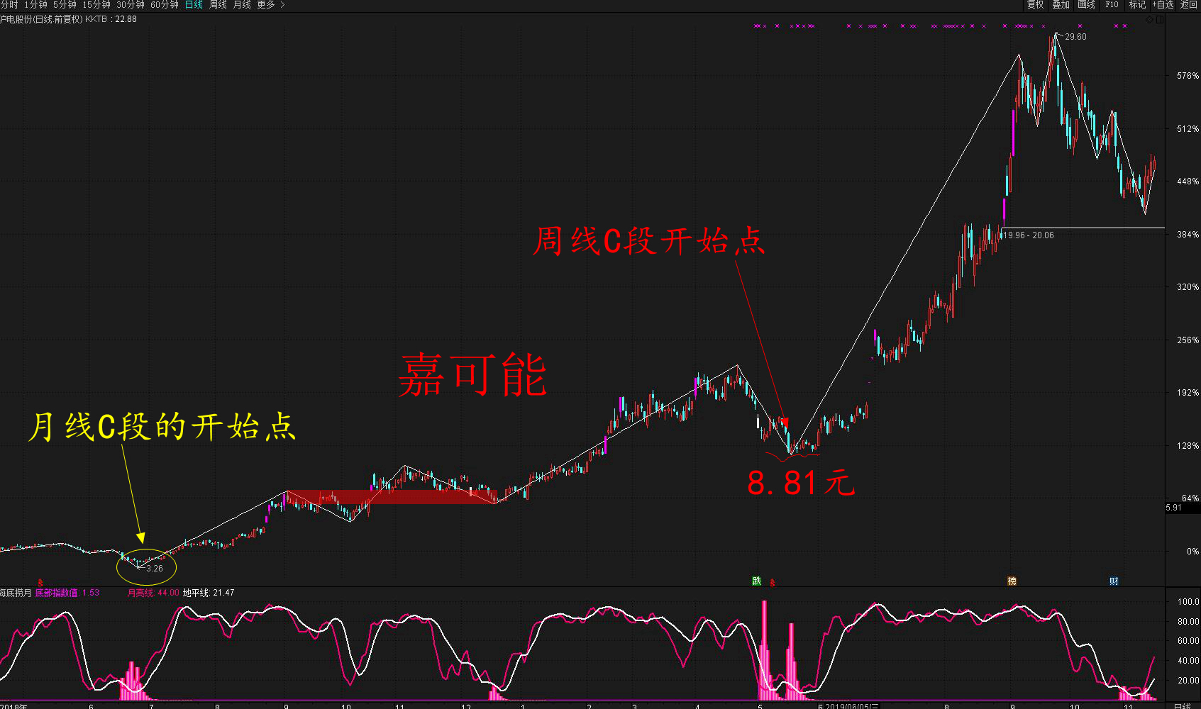 月线的第4段,在周线就是黄色圈处了。因为大周期级别不可能存在标准的缠论趋势结构图。因此,暂时把黄色圈处叫做月线级别的C段(上图所示)。所以,我们只能找C段最近的离开段,如上图所示,就是周线的第3段。因为只要它的内部结构存在背驰,第3段的笔就结束,对应的就是向下笔。同样,需要按照区间套去日线找周线的第3段的内部结构。当时的最低价是8.81元,时间大致在2019年5月,如下图所示: