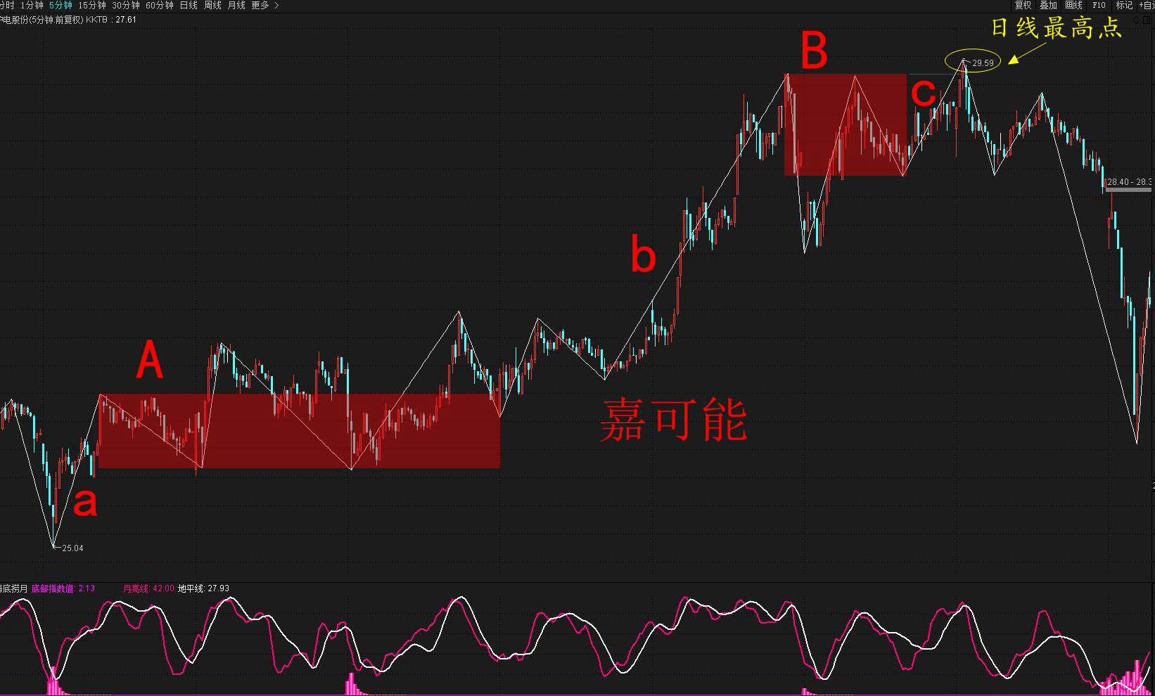从月线C段的开始点分解,在日线上已经构筑了中枢A 与中枢B,也就是缠论标准化公式(a+A+b+B+c)如下图所示: