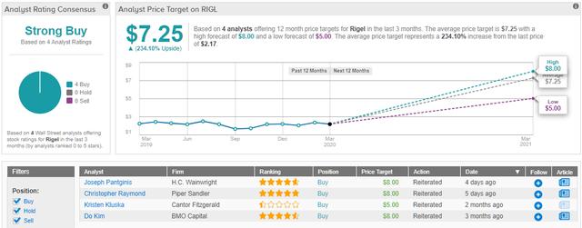 总而言之,Rigel的4个一致买入评级合并为“强买入”共识评级。平均价格目标为7.25美元,意味着234%的上涨空间。
