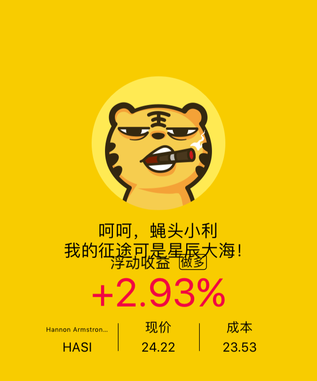 $Hannon Armstrong Sustainable Inf(HASI)$这个之前已分享:不知是美女还是丑八怪?现在谁都知道是什么了!但是这只是蝇头小利,据股谚云:长线是金,短线是银!师傅引进门,修行看个人!