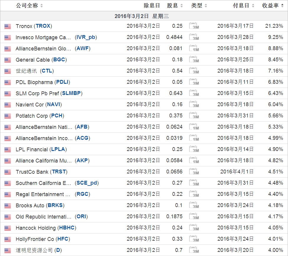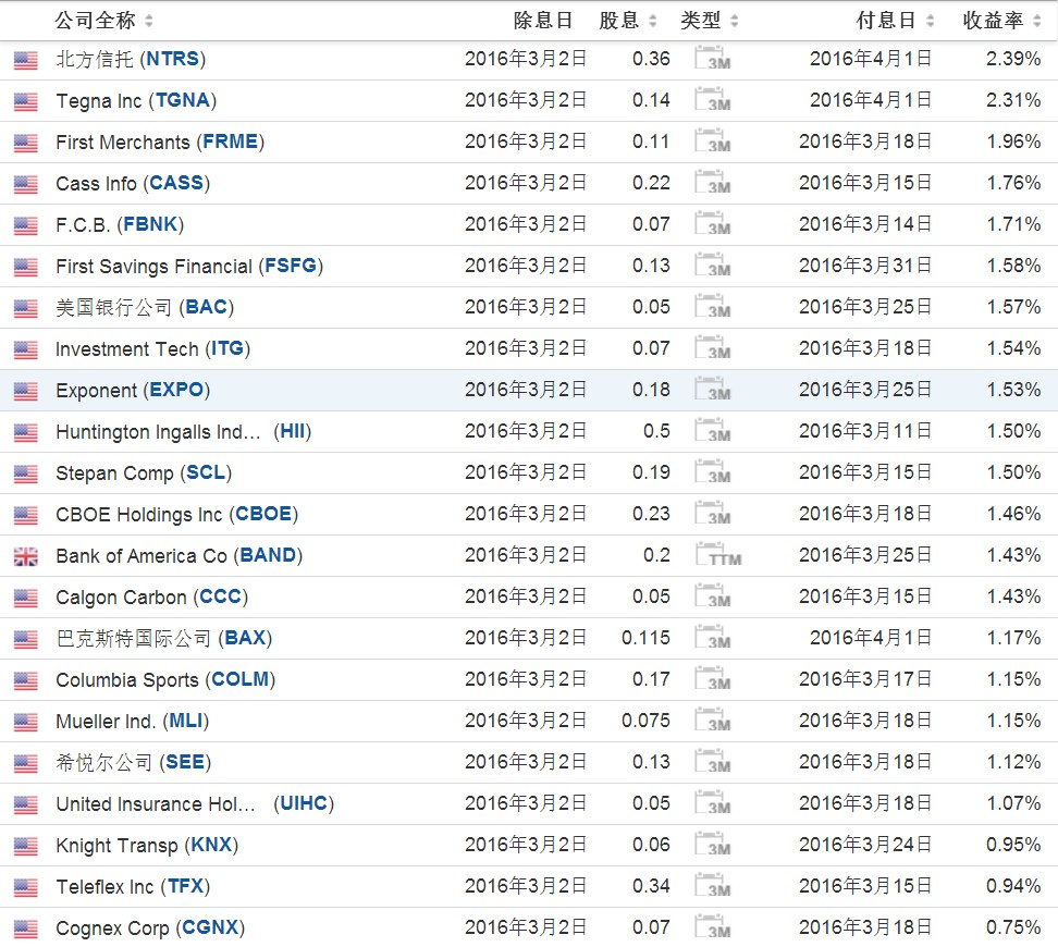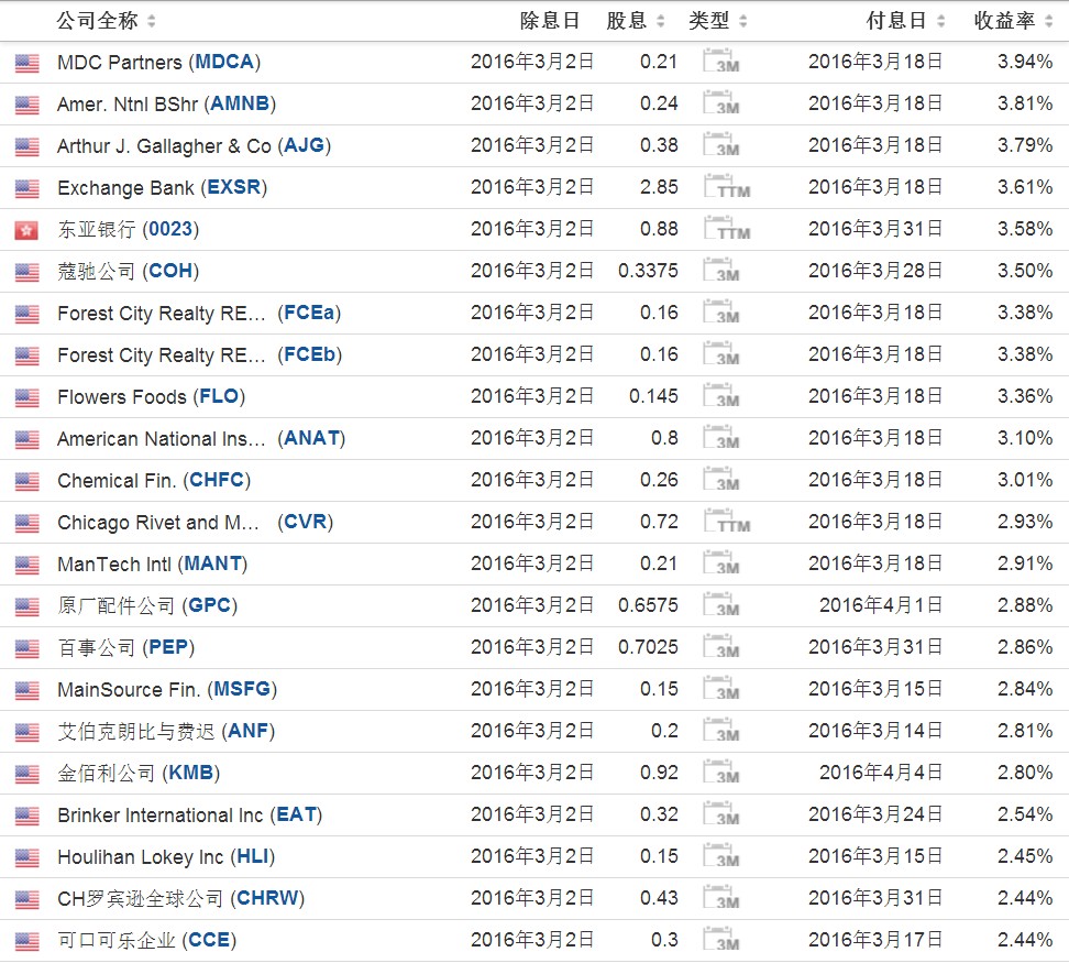 以下这些公司将于3月2日除权除息。类型中1M代表本月分红,3M代表本季度分红,TTM代表本年度分红。收益率是预计的年收益率。请注意风险。