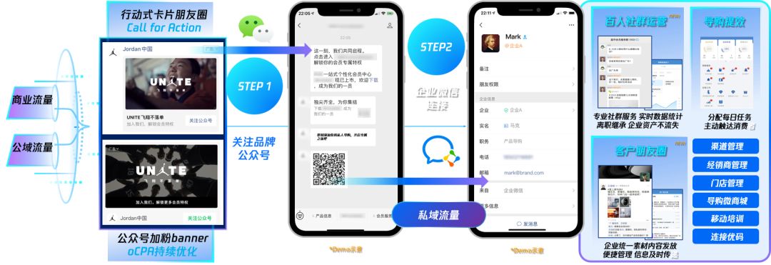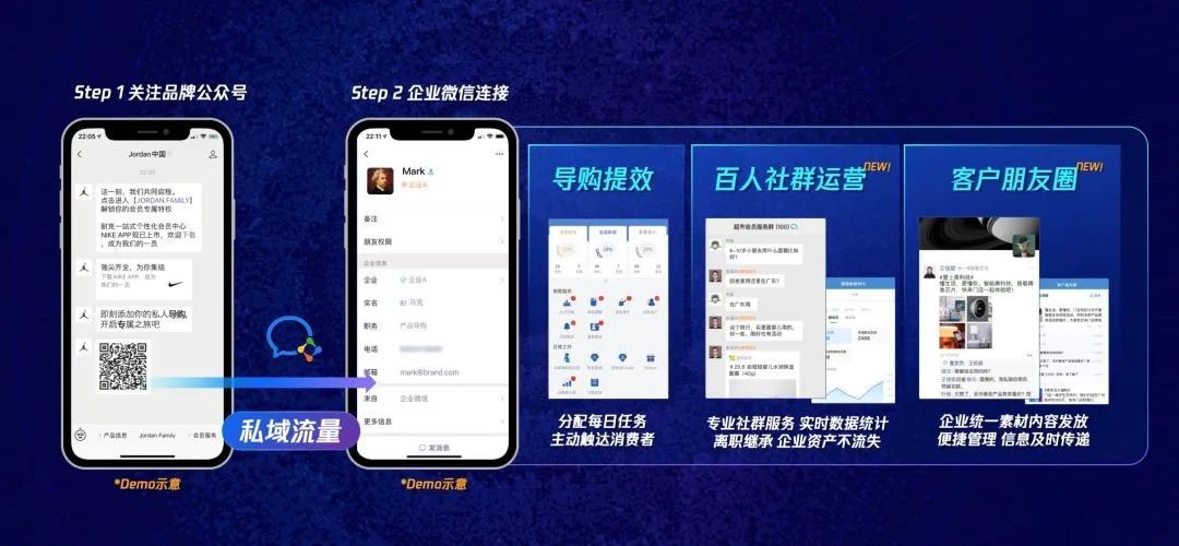 其次,通过创建多个企业微信并分配给品牌商家,将投放广告和线上推广获得的“增量用户”和原有会员的“存量用户”均可分发至这些企业微信,品牌商家的导购可以通过企业微信发私信、建立微信群发送商品或促销信息来提升复购率。