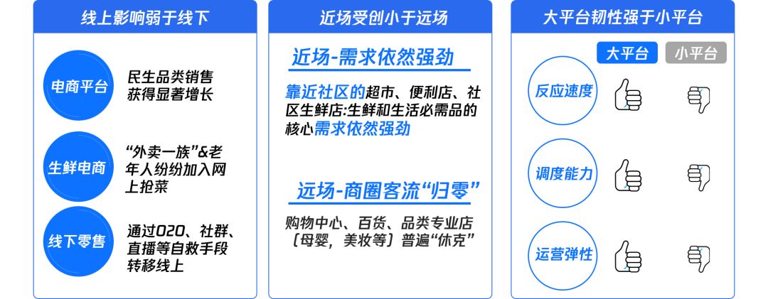 其中自营模式为主的超市、便利店、社区店等在此次疫情中属于“正向影响”, 而对于平台模式的百货商场和购物中心及关联的化妆品、服装、家居家电等实体品牌商家和餐饮、酒店均是“负向影响”。