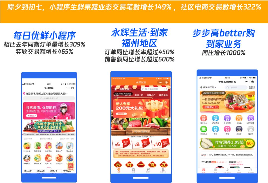 仅除夕到初七,根据腾讯广告报告数据:小程序生鲜果蔬业态交易笔数同比增长149% ,社区电商业态交易笔数同比增长322%。