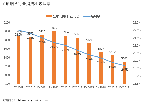 传统烟草行业一直以高利润率、高税负著称,但仍是典型的夕阳产业,近5年来全球卷烟销量基本以1%-2%的速度逐年递减,并且这种下滑的趋势很可能会维持下去。