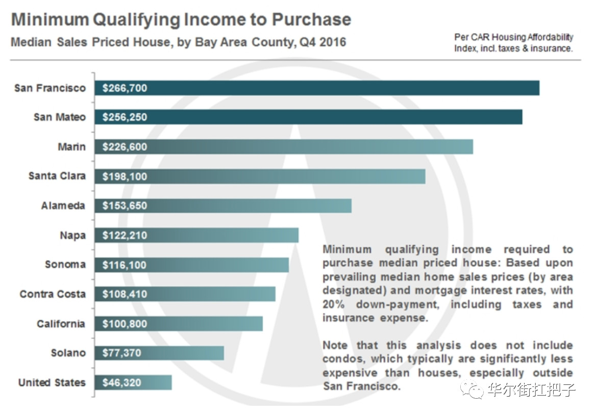 下面是负担湾区各地房子的最低家庭年收入,与全美平均4万6相比,一年26万美元的家庭收入只是旧金山地区购房的门槛。