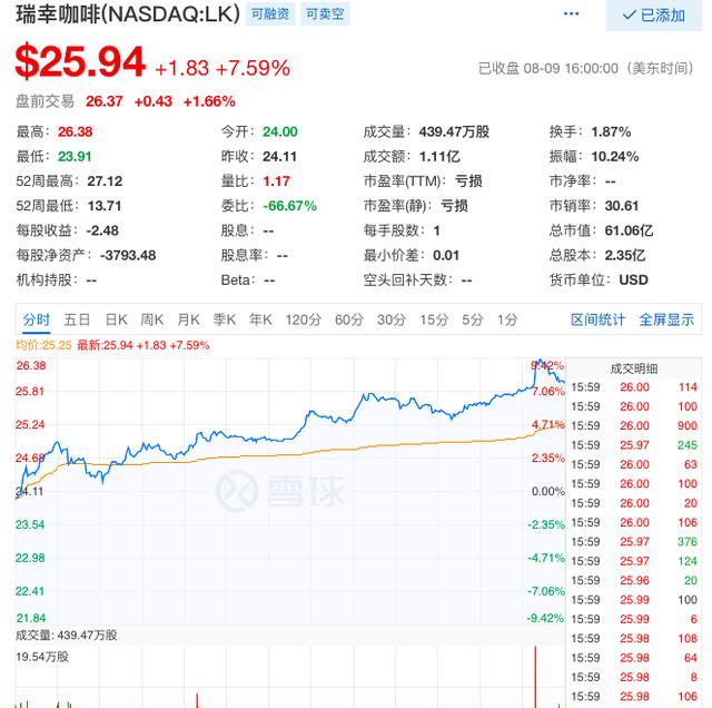 由于亏损严重,瑞幸咖啡上市后饱受舆论质疑,但与舆论态度相反的是,瑞幸咖啡股价持续上涨。截至发稿前,瑞幸咖啡股价25.94美元,较17美元的发行价上涨73%,涨幅领跑中概股。 $瑞幸咖啡(LK)$
