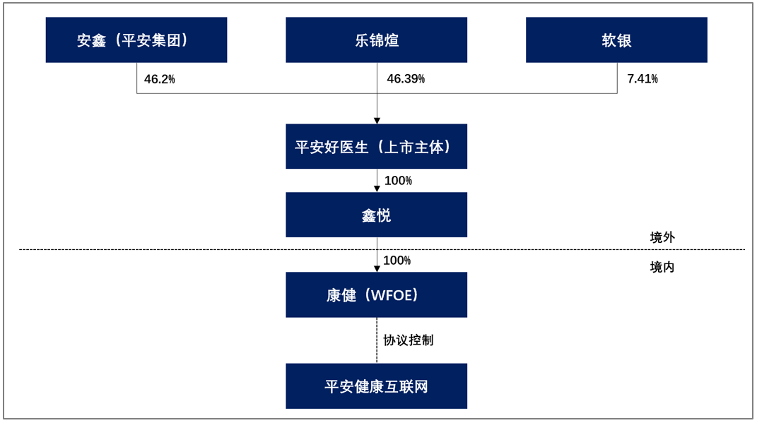 2014年11月,中国平安在开曼群岛设立平安健康医疗(平安好医生,境外上市主体),平安集团控制的安鑫占股70%,管理层持股主体BQJ持股30%。