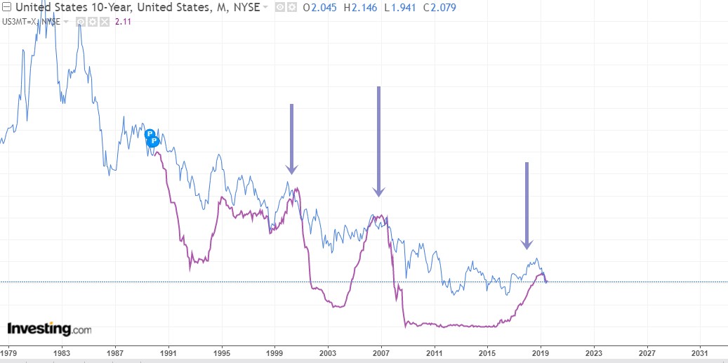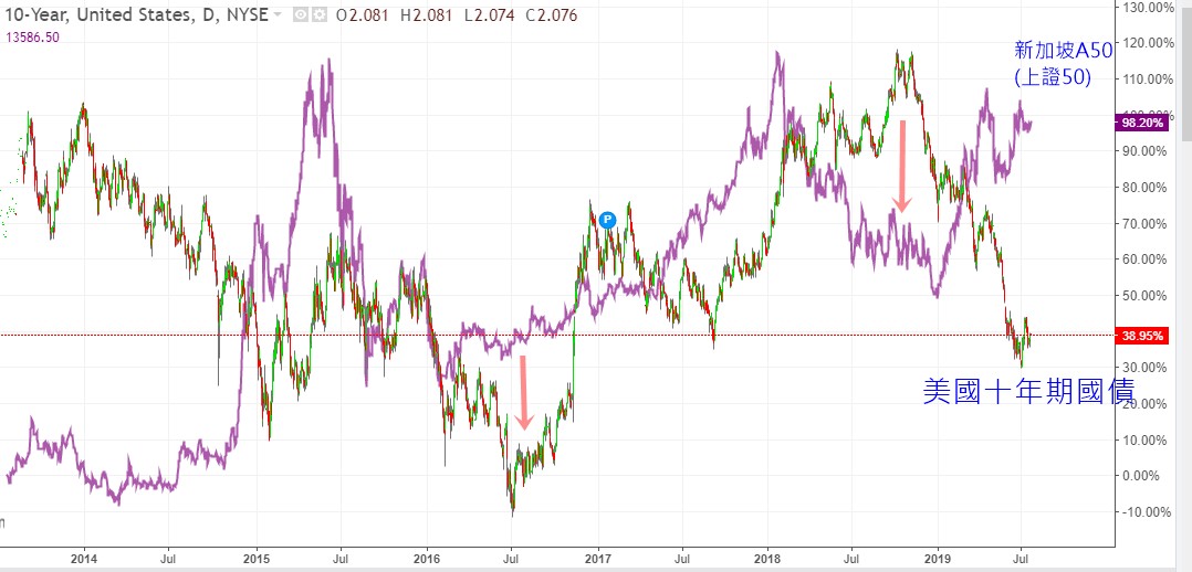 上图是新加坡A50(上证50)及美国十年期国债,美债跟A股的关系是美债上升,股市下跌,因为是担心美国的缩表紧缩。如本文的分析,如果美债有机会在2.06/1.73的位置中企稳。之后反弹,除非美国可以使债息变成负利率。否则即表示美国降息对美国债券影响有限。那也可能表示股市有机会在美国降息前后,到了顶之后有振荡回调。