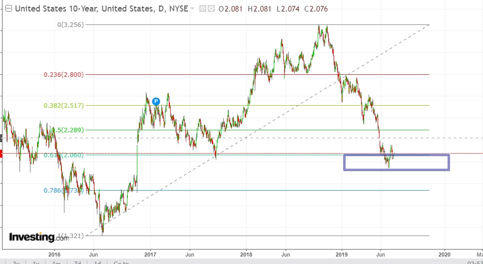 而美国十年债息在0.618的位置,即2.06的位置,而十年的低位是1.3左右,相信美债有机会在2.06/1.73的位置中企稳。