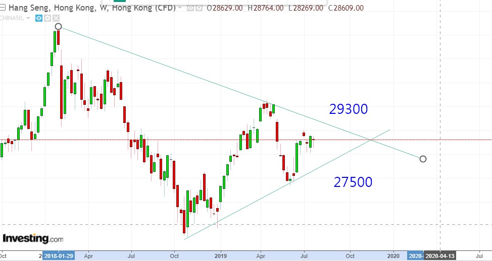 恒生指数目前走势处于待变的位置,目前股市有机会在近日先试一次29300/27500,而笔者认为向下的机会比较大,而读者要留意7月29日及8月1日的江恩转势日。