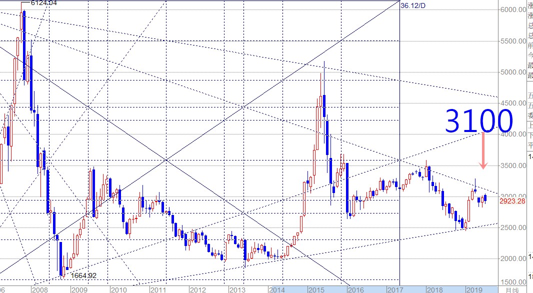 先论上证指数,目前上证指数在月线图中3100点久顶不上,目前在月线图中横盘整理,而下方支持在约2500点。