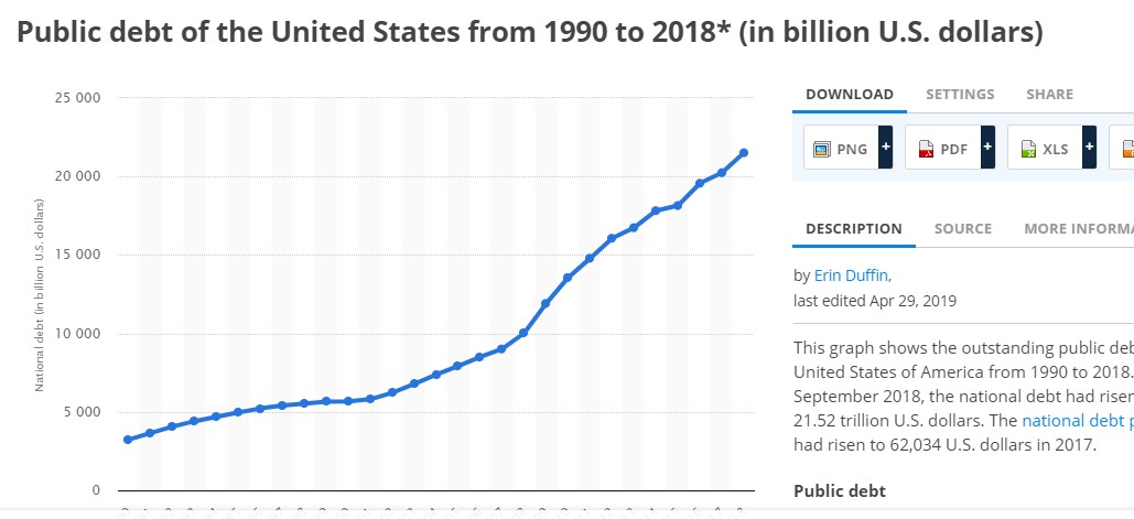 2008年美国次贷危机全面爆发后以增加财政支出的方式刺激经济,导致美国公共债务一路飙升。在奥巴马执政期间,美国国债增加了近10万亿美元,并发生了2次债务上限危机(debt ceiling crisis)。特朗普接手白宫后,实施了大规模的减税措施,因此美国政府的财政赤字问题进一步加剧,公共债务也连续突破20万亿美元和22万亿美元大关。