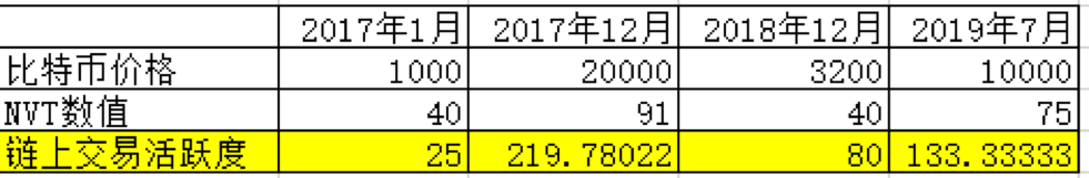 黄线是比特币价格,红线是NVT价格,狂人分别拉取2017年1月,12月,以及2018年12月,2019年7月这4个数值来给大家说明本轮市场没有赚钱效应的原因。如下表: