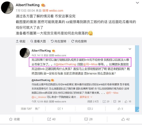何一原话:“销毁左边和右边没有区别。目前大部分交易平台收入是美金和BTC,我们是BNB,币安的收入都是BNB,左边是收入利润,右边是团队的BNB,销毁左边和右边没有区别。”