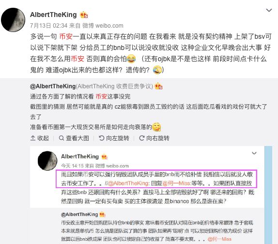 其中,在销毁风波进行中还出现了个关于“契约的插曲”,原LinkVC的合伙人张力艾特了何一,提出了一个尘封已久的问题:“作为币安ICO白皮书上的一员,我想问问当时承诺给大家的千分之一是股权还是币?” 所谓的“千分之一”事件,是当年币安创始人赵长鹏准备做币安的ICO时,跟很多位当时的行业前辈承诺做币安的顾问会得到千分之一的BNB作为酬谢。张力就是当时币安的顾问之一。千分之一的BNB可不是小数目。BNB发行2亿枚,千分之一就是20万枚,以30美元/枚计算,就是600万美元。